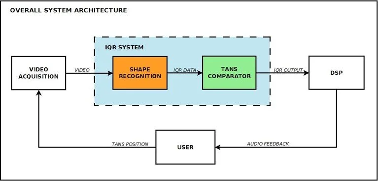 Then, the visual input is processed through IQR (See Figures Below), which sends the tangram coordinates to the programming software PD. After receiving the coordinates from IQR, the algorithm embedded in PD performs digital-signal processing to convert the tangram coordinates into an audio signal, thus generating the audio feedback that the player follows to correctly place the tangram pieces on the tabletop surface.