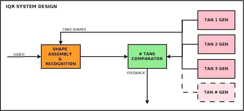 TANTAN internal processes are operated by two software: (1) IQR, A large-scale neural systems simulator, and (2) Pure Data (or PD), an open-source visual programming language for multimedia. A camera placed at the bottom of the tabletop detects the shape and the position of the tangram pieces that are being manipulated by the player.